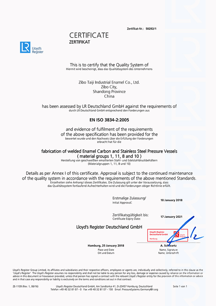 淄博太極在中國搪玻璃設(shè)備制造行業(yè)中首家通過ISO90001質(zhì)量體系認證,并擁有美國ASME認證、歐洲PED認證以及國家部門頒發(fā)的搪玻璃制造許可證、進出口許可證和百余項榮譽證以及三十六項專利等。